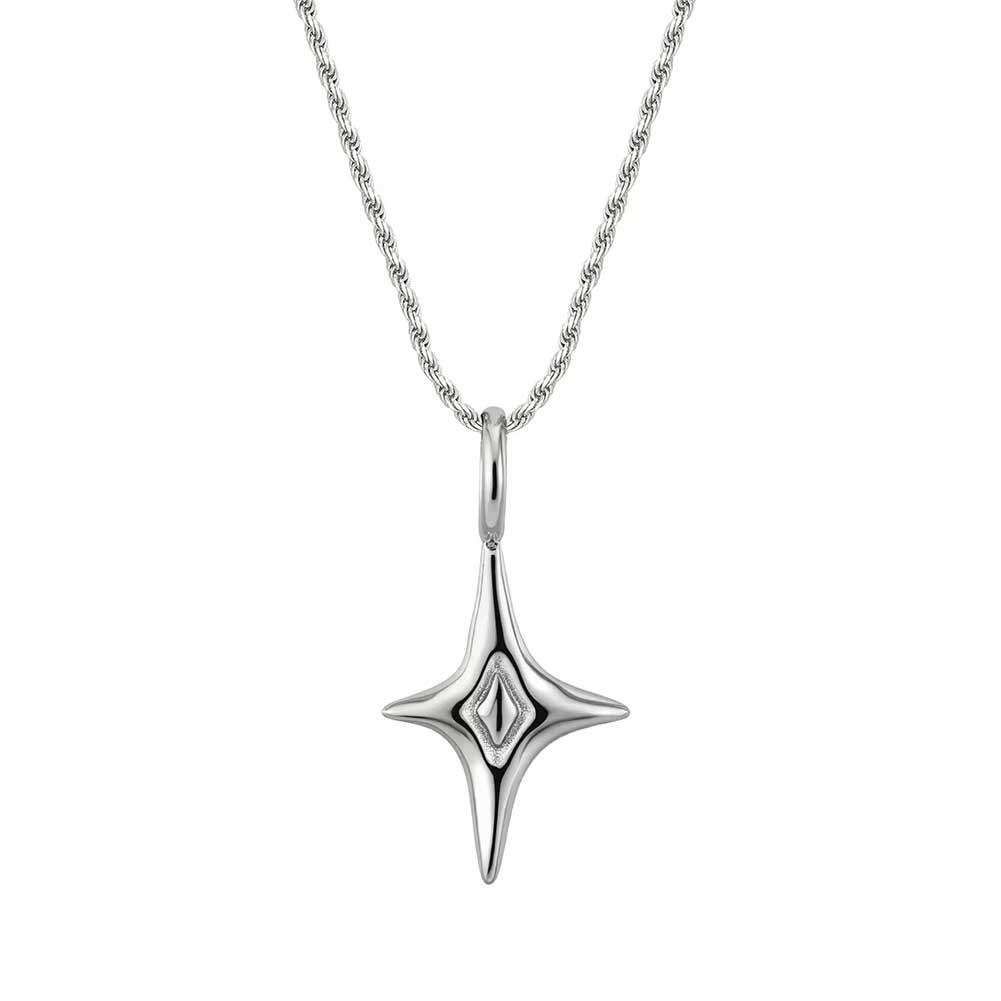 Este collar presenta un dije de diseño abstracto y pulido, cuya silueta evoca una estrella en movimiento. Su forma fluida y precisa transmite constancia y enfoque, convirtiéndolo en una pieza atemporal que se integra con naturalidad a cualquier estilo.